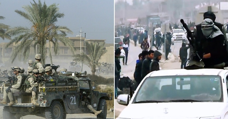 esquerda, soldados norte-americanos patrulam a cidade de Falluja, em 7