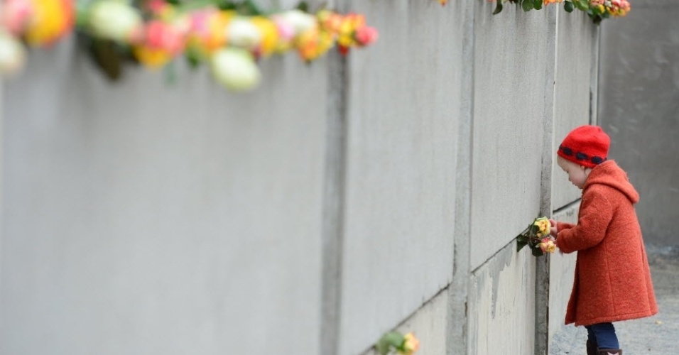 - Criança enfeita um trecho preservado do muro de Berlim com flores