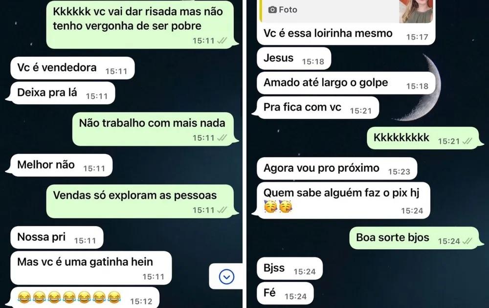 Priscila enviou a foto para saber até onde ele iria. "Desculpa aí, amiga. 'Nóis' tá na luta. Não sabe quem é quem. Você tem entendimento. PIX tá bloqueando. Civil tá atrás. Tá puxado", confidenciou o golpista à vítima.