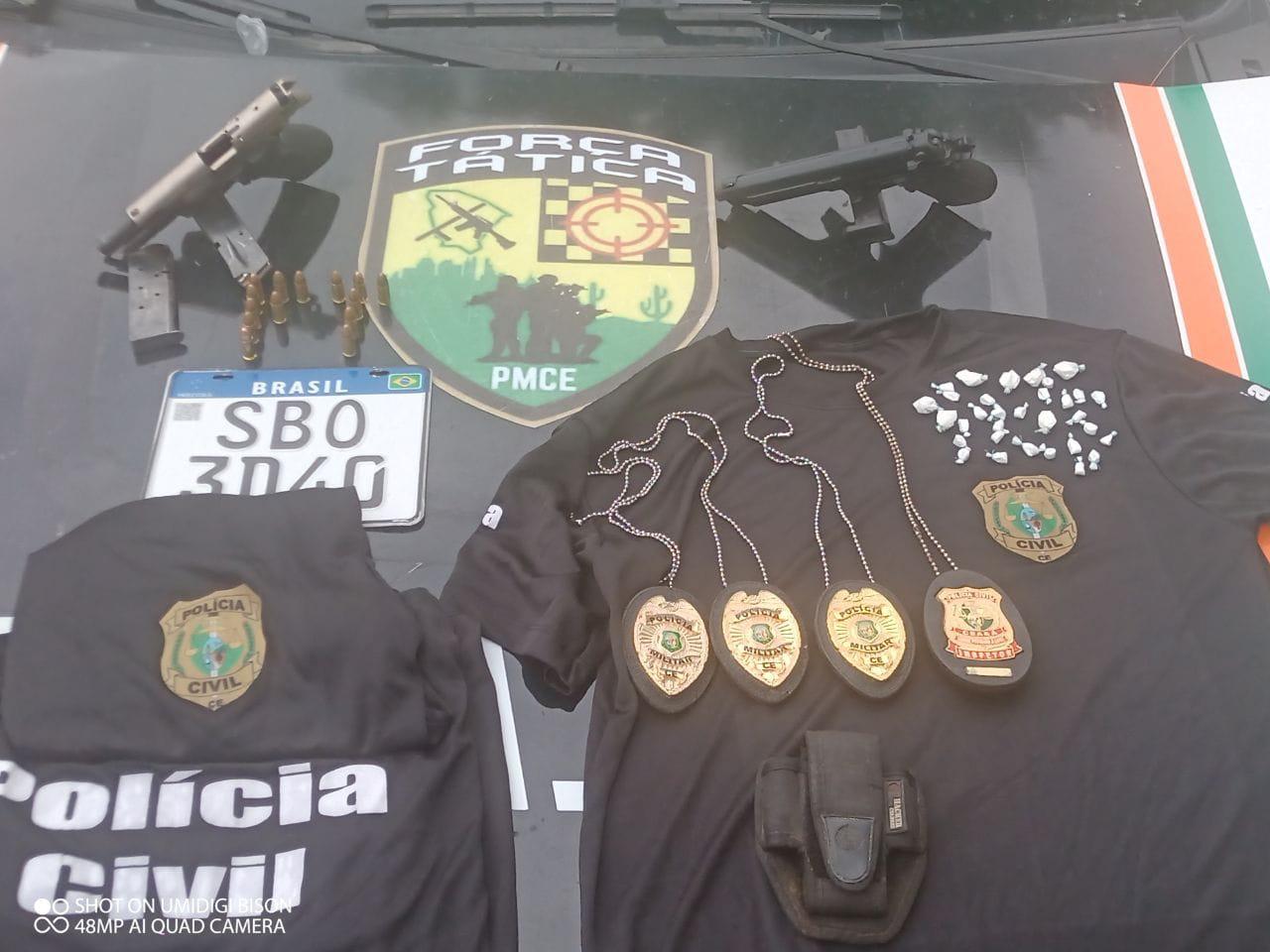 "Na ação, os policiais militares apreenderam uma pistola 9mm, 14 munições, dois carregadores de pistola, um porta-algema, um simulacro de pistola, um carro com a placa adulterada, uma moto, 9g de cocaína, camisas da Polícia Civil e distintivos policiais", disse a PMCE.