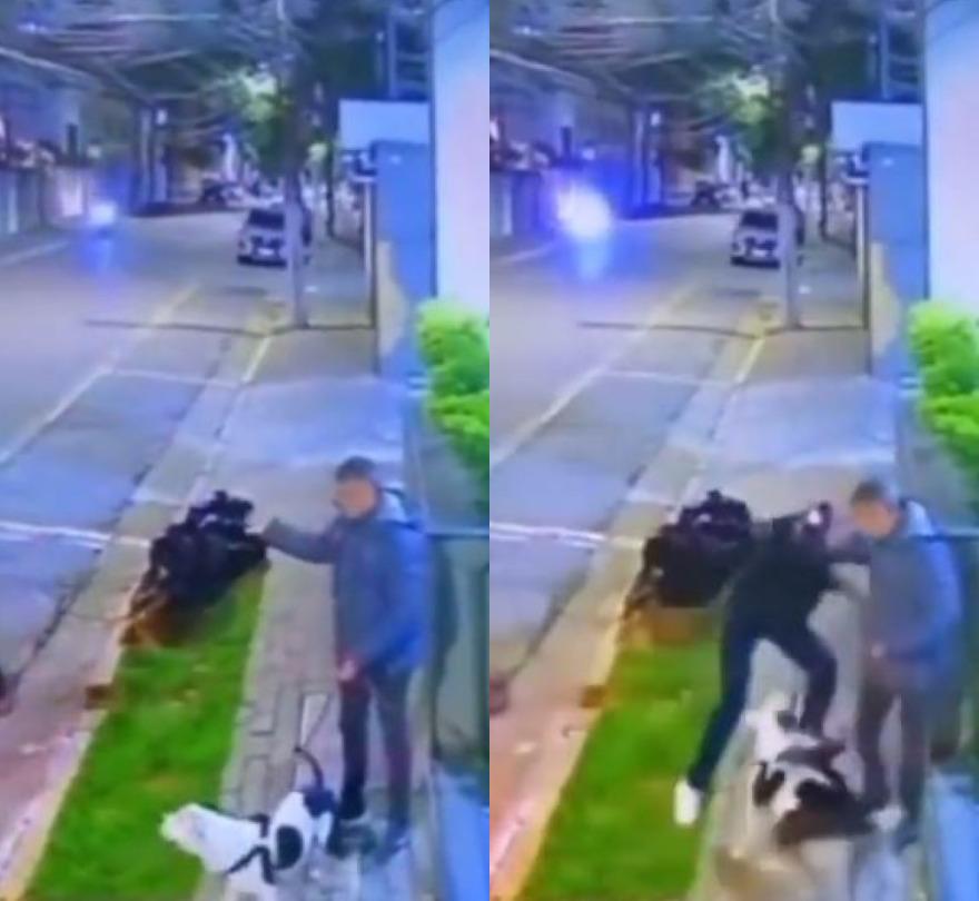Na ocasião é possível observar o tutor e o animal passeando em uma calçada quando o homem repara que uma moto — que havia passado momentos antes no sentido contrário ao dele — estava retornando em sua direção.