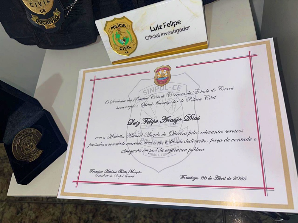 O secretário-geral destacou o papel do homenageado e dos demais profissionais da segurança pública. “Parabenizamos o Oficial Investigador Luis Felipe pela dedicação, coragem e profissionalismo na defesa da população cearense”, afirmou Narcelio Nascimento.